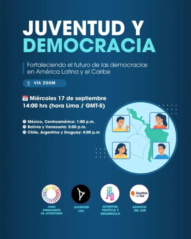 Fortaleciendo el Futuro de las Democracias en América Latina y el Caribe”, un espacio virtual para el diálogo y la reflexión colectiva entre jóvenes de la región sobre el estado de la democracia, identificando desafíos, oportunidades y propuestas para fortalecer la participación juvenil y la defensa de los derechos humanos. Es liderado por Juventud, Política y Desarrollo (JPD), en colaboración con Juventud LAC, el Foro Permanente de Juventudes y Asuntos del Sur.