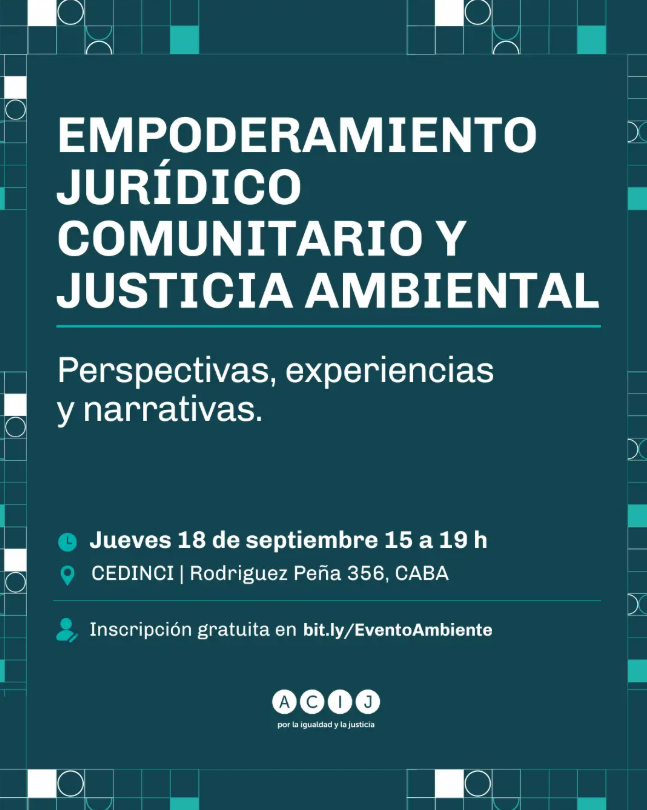 El día jueves 18 de septiembre, de 15 a 19hs realizaremos en el CEDINCI (Rodriguez Peña 356, CABA) el evento abierto y presencial «EMPODERAMIENTO JURÍDICO COMUNITARIO Y JUSTICIA AMBIENTAL. Perspectivas, experiencias y narrativas».