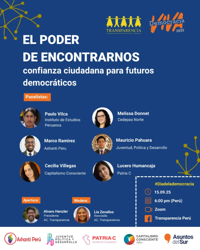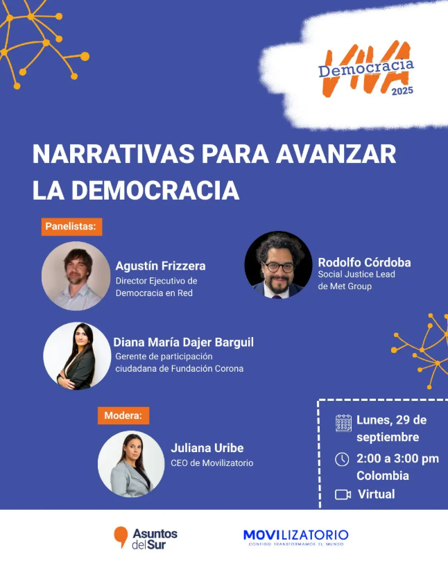 El evento busca explorar nuevas formas de participación política frente al debilitamiento de la representación y la desilusión ciudadana. Se centra en cómo reconstruir la confianza en la democracia mediante la acción colectiva y cotidiana, analizando retos actuales y abriendo posibilidades para una democracia más cercana, confiable y participativa. Se abordarán preguntas clave como: qué significa confiar en la democracia hoy, qué herramientas son necesarias frente a la fragmentación y la desinformación, y cómo imaginar un modelo democrático que sea representativo y a la vez participativo y cotidiano.
