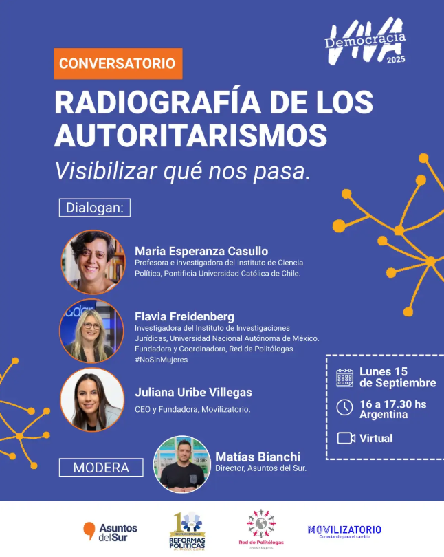 Este conversatorio reunirá a especialistas internacionales y referentes locales para analizar cómo estas señales tempranas pueden detectarse y medirse, así como para debatir estrategias que fortalezcan la resiliencia democrática, reflexionar sobre los patrones de deterioro democrático y pensar estrategias de defensa institucional y ciudadana. Discutiremos cómo reconocer las señales tempranas de autoritarismo, cómo se articulan en la práctica política, y qué aprendizajes globales pueden fortalecer la resiliencia democrática en América Latina.