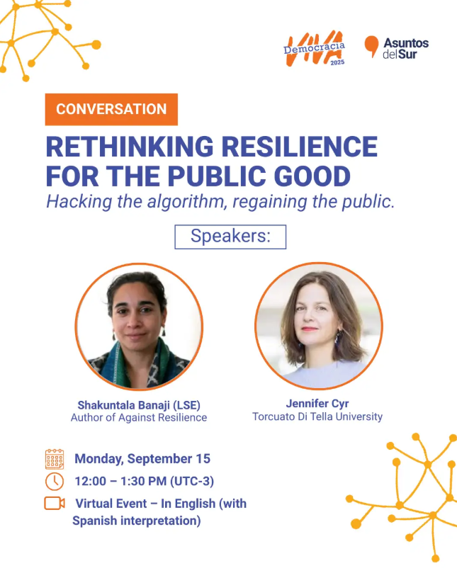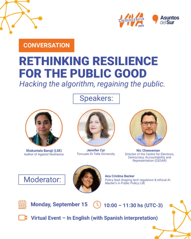 Este panel abordará distintos enfoques del concepto de resiliencia: de las democracias, la participación y la esfera pública. Los profesionales abordarán los desafíos actuales y calls to action.