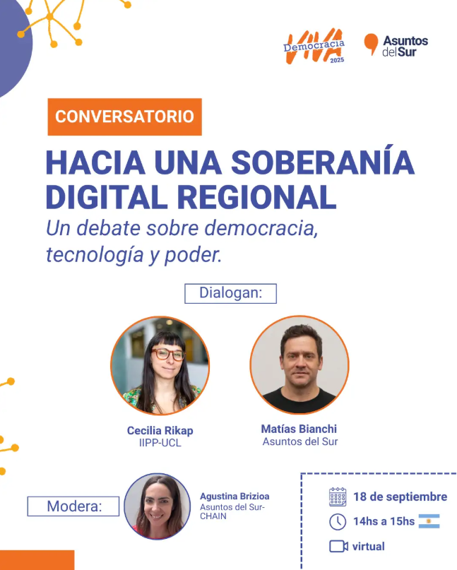 La concentración del poder tecnológico en pocas manos amenaza la autodeterminación democrática. Plataformas, IA e infraestructuras digitales influyen en cómo debatimos, nos gobernamos y ejercemos derechos. Este conversatorio propone reflexionar sobre cómo fortalecer la soberanía digital y recuperar la capacidad de nuestras sociedades para decidir de manera autónoma cómo nos relacionamos con la tecnología.